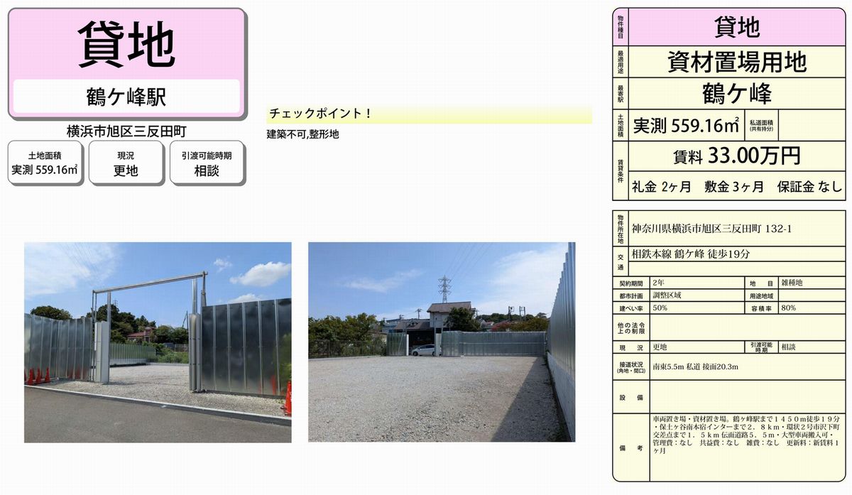 備考 | 車両置き場 資材置き場 安全鋼板有 |
