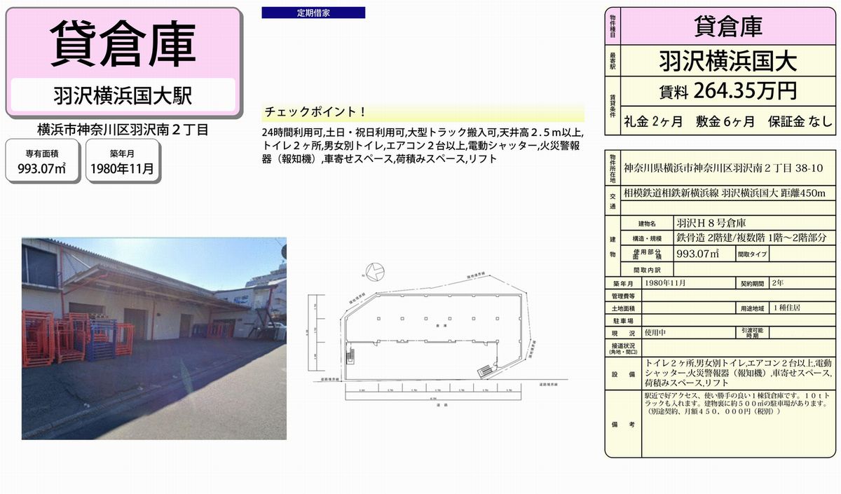 神奈川県横浜市神奈川区羽沢南2-38-10 (羽沢横浜国大) 羽沢H8号倉庫 詳細データ