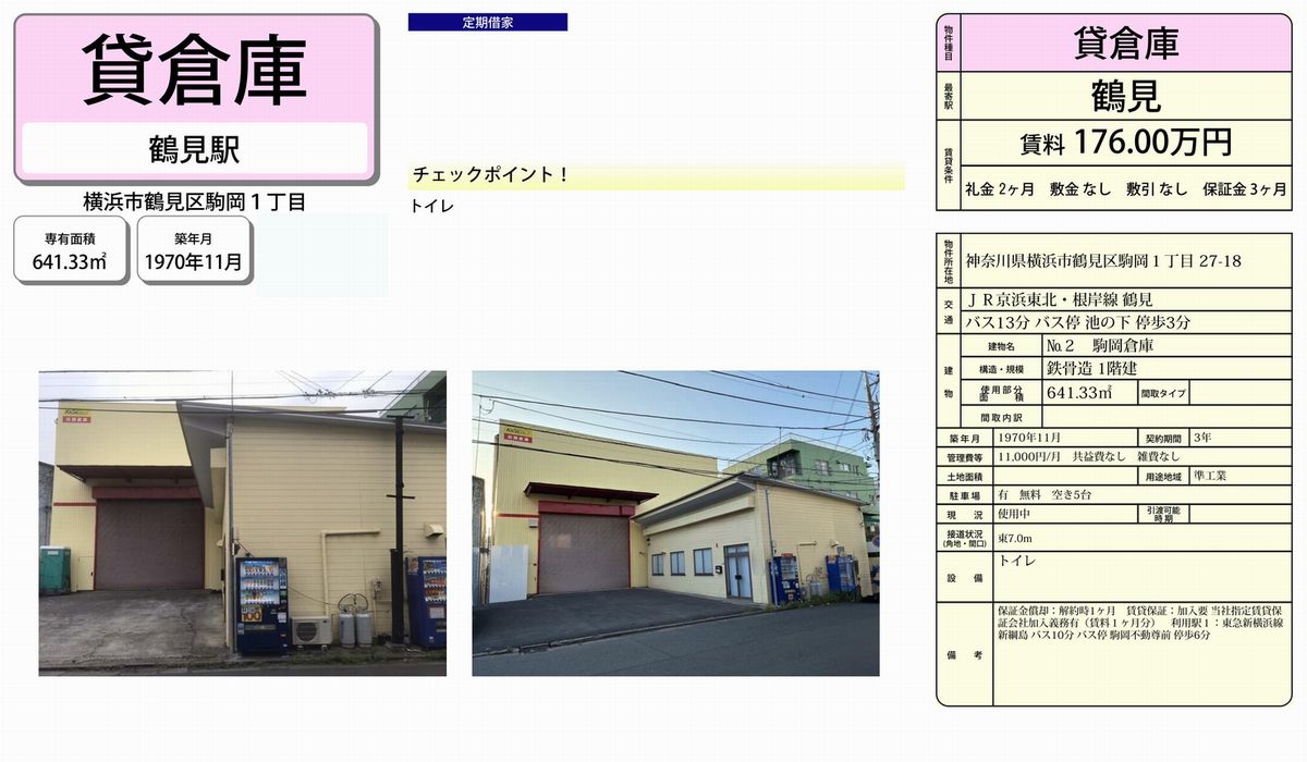 神奈川県横浜市鶴見区駒岡1-27-18 (鶴見) 駒岡倉庫 作業所 詳細データ