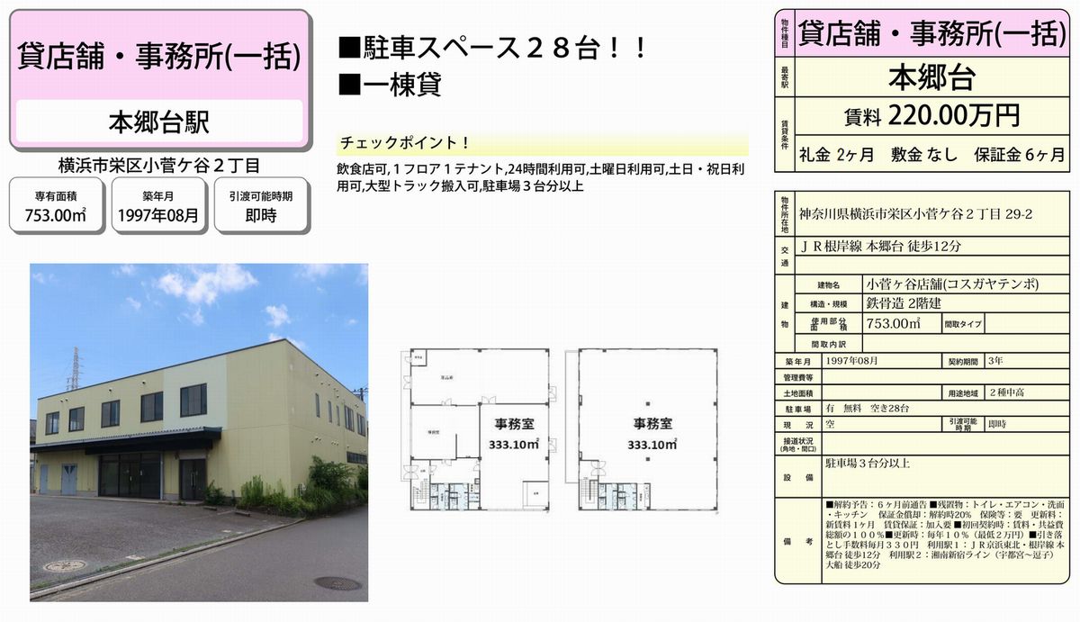 神奈川県内の貸倉庫・貸工場・賃貸土地の情報満載(トップ) > 神奈川のエリアで探す > 横浜市栄区 > 本郷台 > 横浜市栄区小菅ケ谷2-29-2 小菅ヶ谷建物 P28台付