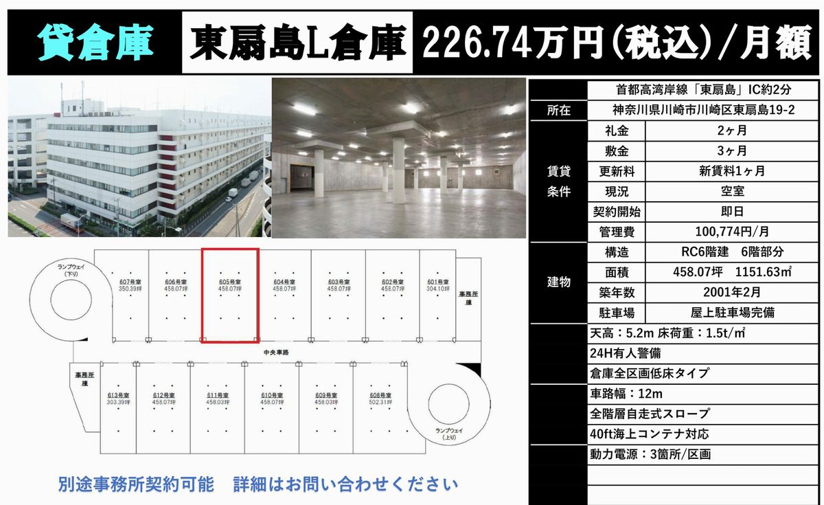 この物件の物件番号は5971です。お電話(03-6260-658603-6260-6586)でお問合せの際は物件番号をお知らせ下さい。「神奈川倉庫ドットコムを見て」とお伝えいただくと話がスムーズに進みます。※不動産業者様へのご紹介は不可です。
