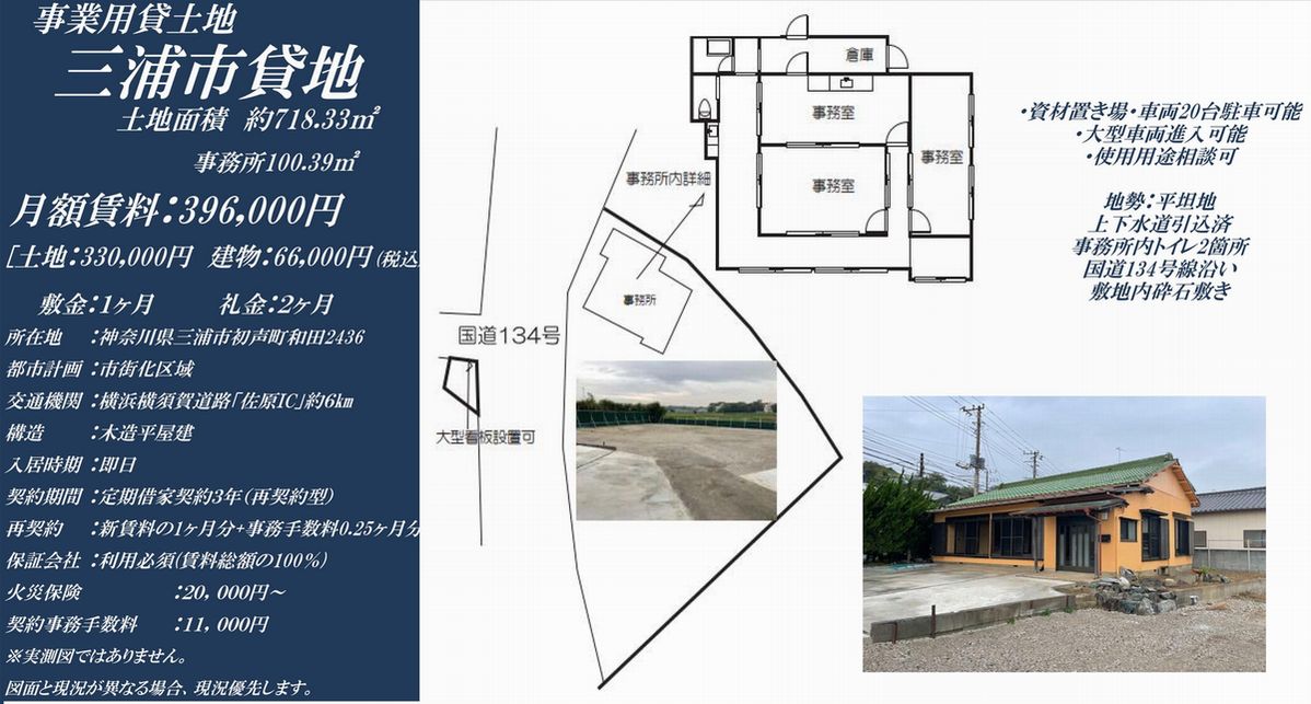 | 備考 | 事務所付(トイレ有) 資材置き場 車両20台駐車可 大型車両進入可 |