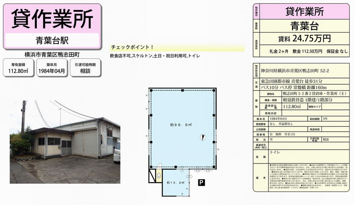 神奈川県横浜市青葉区鴨志田町52-2の貸倉庫・貸工場・賃貸土地を探すなら中小企業を応援する神奈川貸倉庫.comでニーズに合った物件を検索してください。神奈川県横浜市青葉区鴨志田町52-2の事務所付貸倉庫、クレーン付、店舗倉庫、工業専用地域等、何なりと営業担当者にお申し付けください。その他、神奈川県横浜市青葉区鴨志田町52-2の貸し倉庫・貸し工場・賃貸土地を貸したい方には無料にて査定・掲載いたしますので当社のオーナーサポートシステムをご利用ください。神奈川県横浜市青葉区鴨志田町52-2で貸倉庫・貸工場・賃貸土地を契約のテナント様には貸し倉庫・貸し工場の設計変更、造作のご相談も承ります。貸倉庫・貸工場・賃貸土地の移転・新規開設は神奈川エリア最大級、新着情報満載、神奈川貸倉庫.com! |