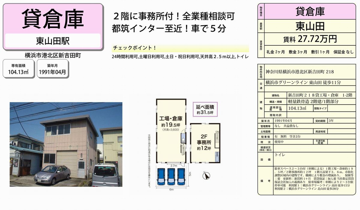 神奈川県横浜市都筑区東山田4-40-5の貸倉庫・貸工場・賃貸土地を探すなら中小企業を応援する神奈川貸倉庫.comでニーズに合った物件を検索してください。神奈川県横浜市都筑区東山田4-40-5の事務所付貸倉庫、クレーン付、店舗倉庫、工業専用地域等、何なりと営業担当者にお申し付けください。その他、神奈川県横浜市都筑区東山田4-40-5の貸し倉庫・貸し工場・賃貸土地を貸したい方には無料にて査定・掲載いたしますので当社のオーナーサポートシステムをご利用ください。神奈川県横浜市都筑区東山田4-40-5で貸倉庫・貸工場・賃貸土地を契約のテナント様には貸し倉庫・貸し工場の設計変更、造作のご相談も承ります。貸倉庫・貸工場・賃貸土地の移転・新規開設は神奈川エリア最大級、新着情報満載、神奈川貸倉庫.com!