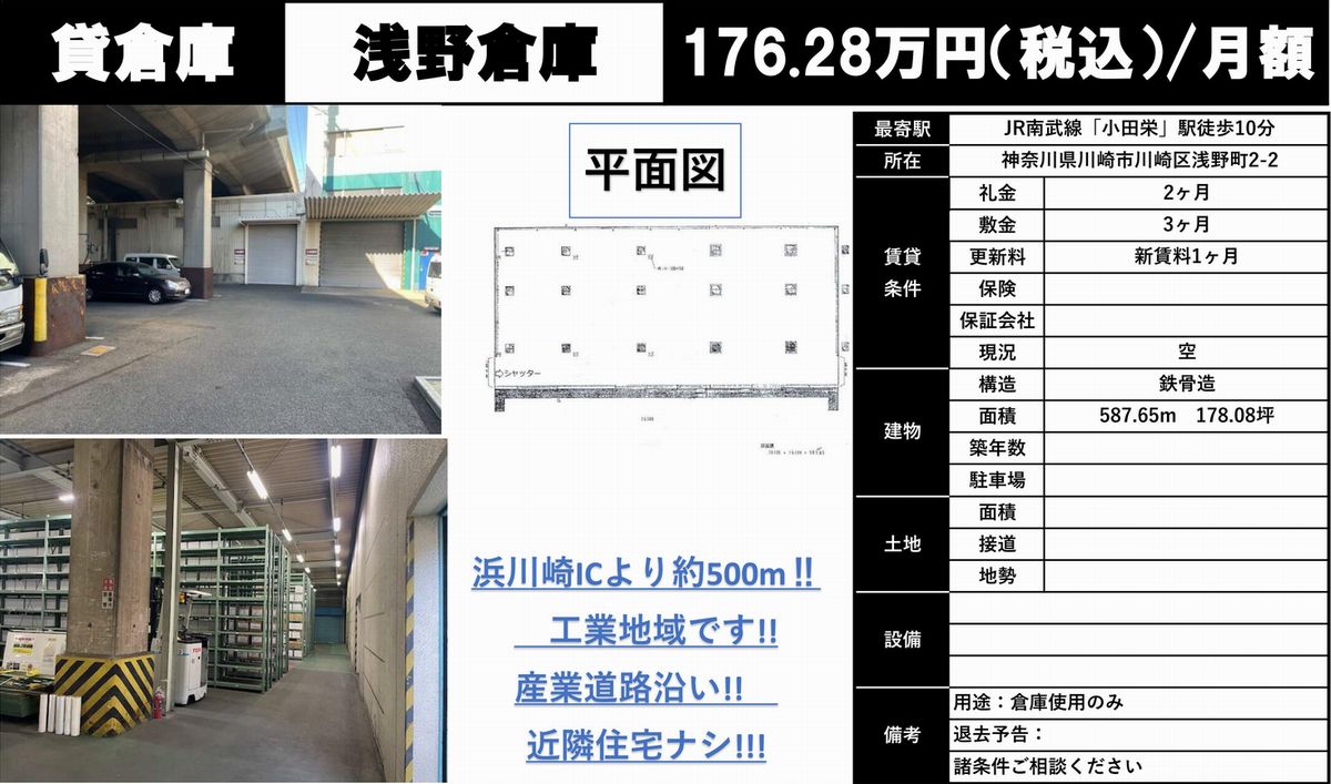 神奈川県川崎市川崎区浅野町2-2の貸倉庫・貸工場・賃貸土地を探すなら中小企業を応援する神奈川貸倉庫.comでニーズに合った物件を検索してください。神奈川県川崎市川崎区浅野町2-2の事務所付貸倉庫、クレーン付、店舗倉庫、工業専用地域等、何なりと営業担当者にお申し付けください。その他、神奈川県川崎市川崎区浅野町2-2の貸し倉庫・貸し工場・賃貸土地を貸したい方には無料にて査定・掲載いたしますので当社のオーナーサポートシステムをご利用ください。神奈川県川崎市川崎区浅野町2-2で貸倉庫・貸工場・賃貸土地を契約のテナント様には貸し倉庫・貸し工場の設計変更、造作のご相談も承ります。貸倉庫・貸工場・賃貸土地の移転・新規開設は神奈川エリア最大級、新着情報満載、神奈川貸倉庫.com!
