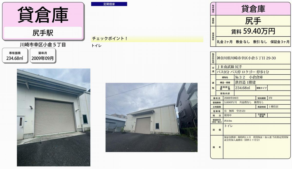 神奈川県川崎市幸区小倉5-29-30 (尻手) 小倉倉庫 詳細データ