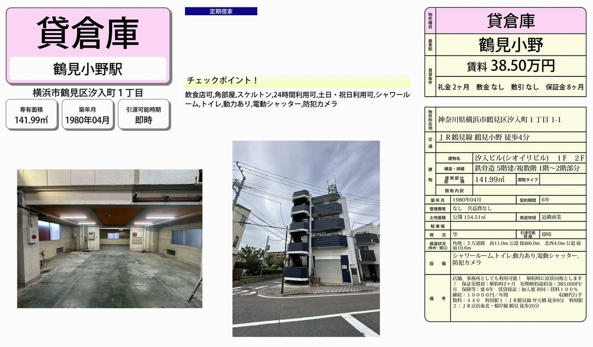 神奈川県横浜市鶴見区汐入町1-1-1の貸倉庫・貸工場・賃貸土地を探すなら中小企業を応援する神奈川貸倉庫.comでニーズに合った物件を検索してください。神奈川県横浜市鶴見区汐入町1-1-1の事務所付貸倉庫、クレーン付、店舗倉庫、工業専用地域等、何なりと営業担当者にお申し付けください。その他、神奈川県横浜市鶴見区汐入町1-1-1の貸し倉庫・貸し工場・賃貸土地を貸したい方には無料にて査定・掲載いたしますので当社のオーナーサポートシステムをご利用ください。神奈川県横浜市鶴見区汐入町1-1-1で貸倉庫・貸工場・賃貸土地を契約のテナント様には貸し倉庫・貸し工場の設計変更、造作のご相談も承ります。貸倉庫・貸工場・賃貸土地の移転・新規開設は神奈川エリア最大級、新着情報満載、神奈川貸倉庫.com! |