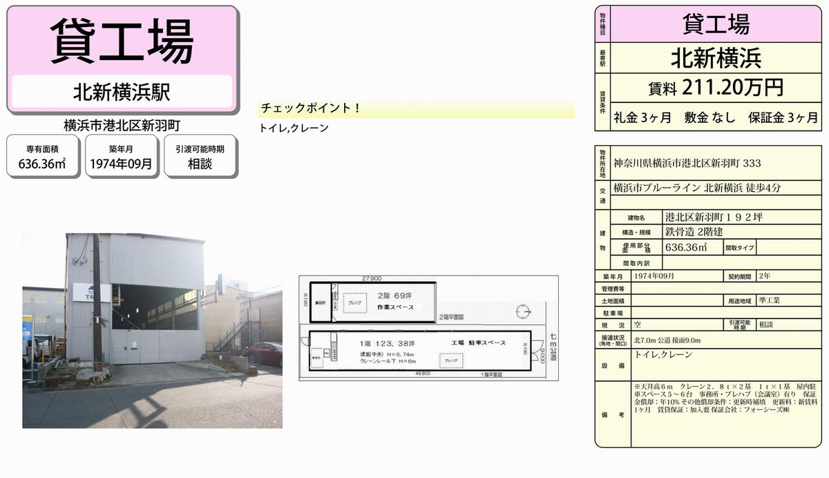 神奈川県横浜市港北区新羽町333 (北新横浜) 北新横浜 工場 詳細データ