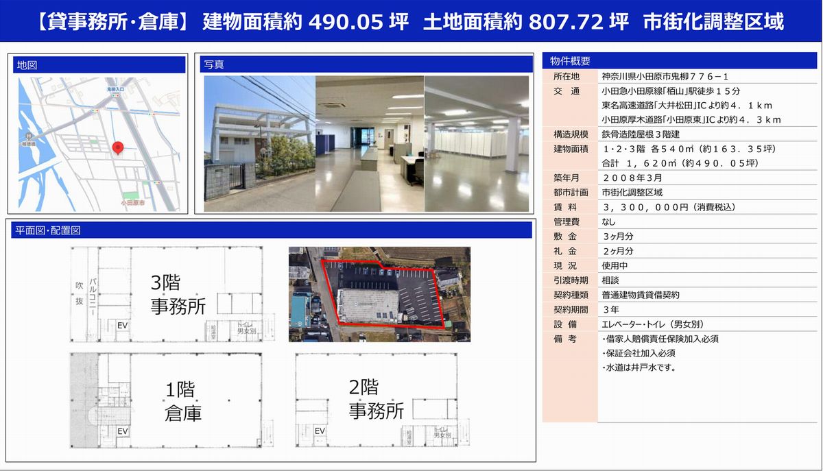 神奈川県小田原市鬼柳776-1の貸倉庫・貸工場・賃貸土地を探すなら中小企業を応援する神奈川貸倉庫.comでニーズに合った物件を検索してください。神奈川県小田原市鬼柳776-1の事務所付貸倉庫、クレーン付、店舗倉庫、工業専用地域等、何なりと営業担当者にお申し付けください。その他、神奈川県小田原市鬼柳776-1の貸し倉庫・貸し工場・賃貸土地を貸したい方には無料にて査定・掲載いたしますので当社のオーナーサポートシステムをご利用ください。神奈川県小田原市鬼柳776-1で貸倉庫・貸工場・賃貸土地を契約のテナント様には貸し倉庫・貸し工場の設計変更、造作のご相談も承ります。貸倉庫・貸工場・賃貸土地の移転・新規開設は神奈川エリア最大級、新着情報満載、神奈川貸倉庫.com! |