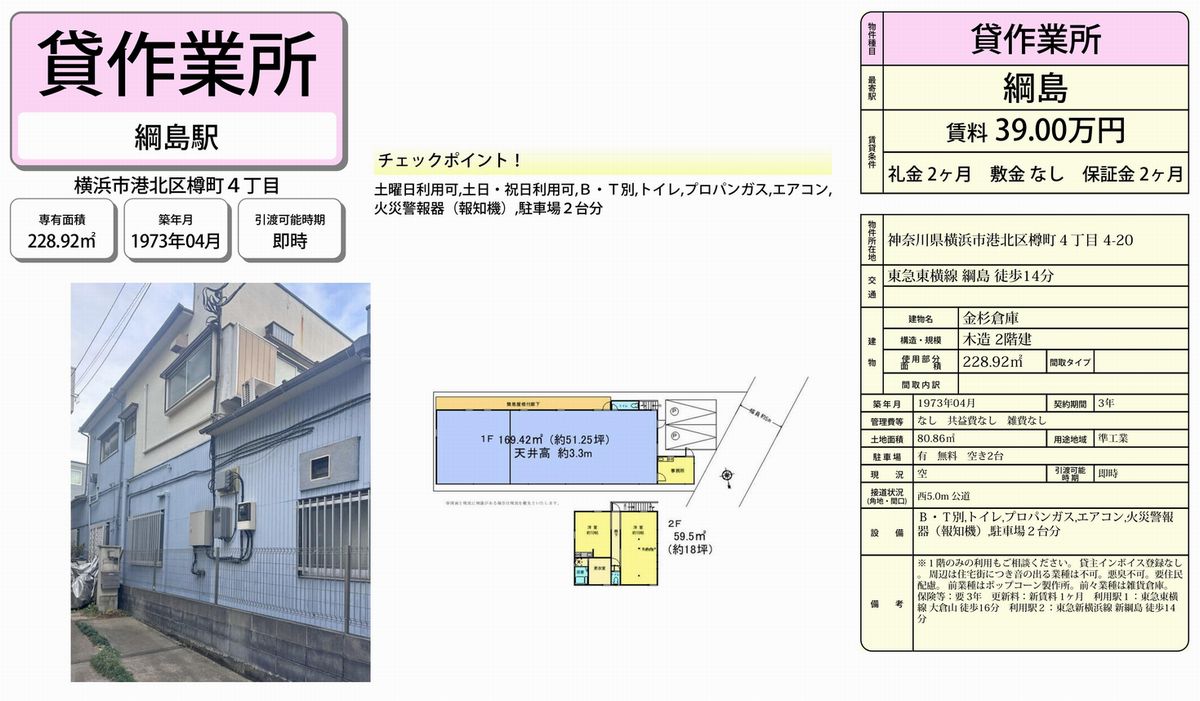 神奈川県内の貸倉庫・貸工場・賃貸土地の情報満載(トップ) > 神奈川のエリアで探す > 横浜市港北区 > 綱島 > 横浜市港北区樽町4-4-20 金杉倉庫
