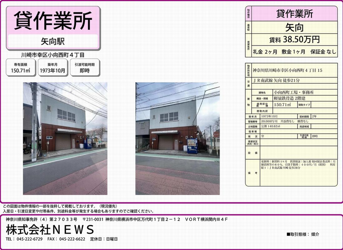 神奈川県川崎市幸区小向西町4-15 (矢向) 矢向 倉庫 詳細データ