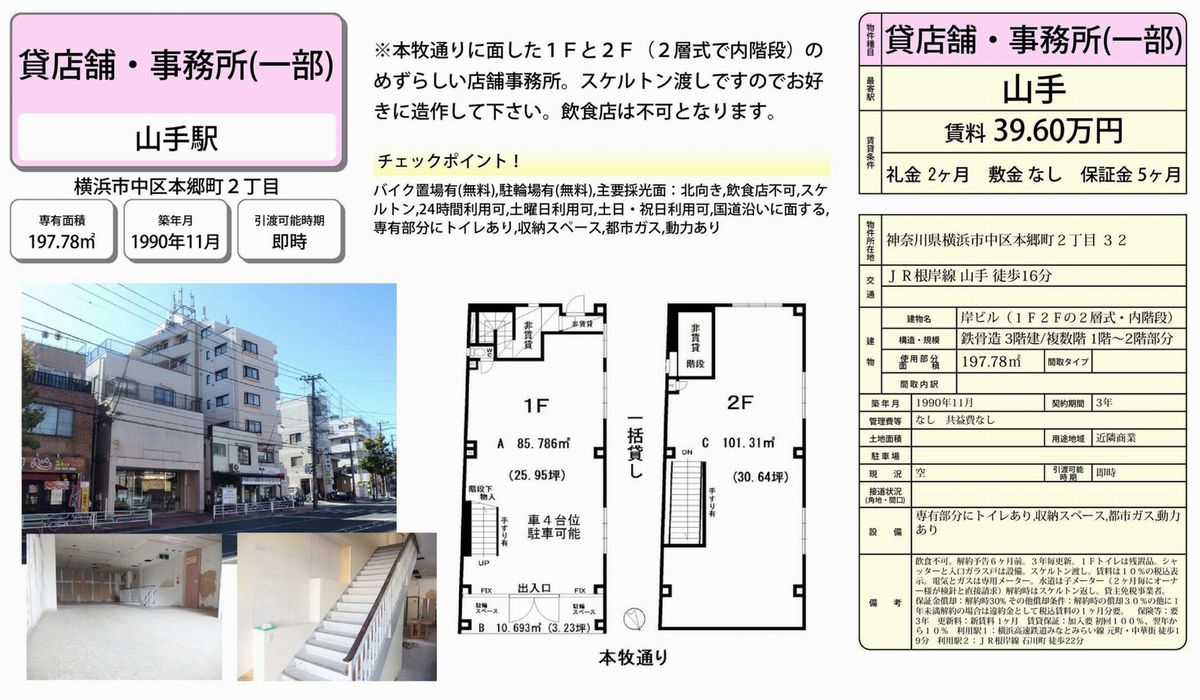 神奈川県横浜市中区本郷町2-32 (山手) 岸ビル 1-2F部分 詳細データ
